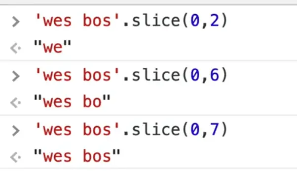 For a quick refresher of how slice works: you pass it a starting and ending index and it will return the charactres inbetween like so.