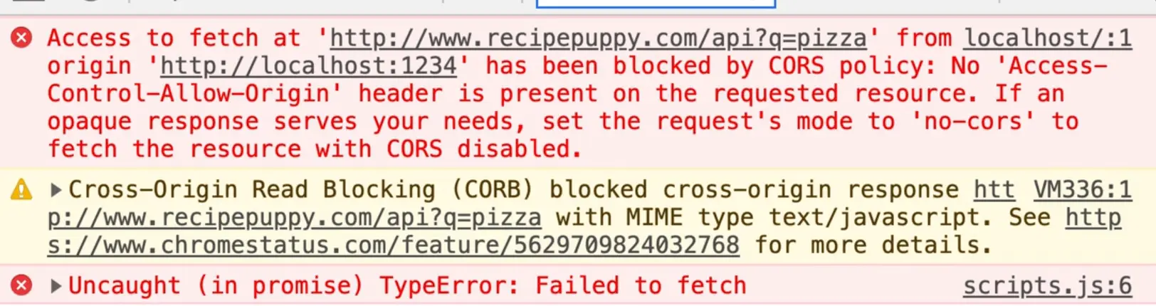 Access to fetch at 'http://www.recipepuppy.com/api?q=pizza' from origin 'null' has been blocked by CORS policy: No 'Access-Control-Allow-Origin' header is present on the requested resource. >If an opaque response serves your needs, set the request's mode to 'no-cors' to fetch the resource with CORS disabled. www.recipepuppy.com/api?q=pizza:1 Failed to load resource: net::ERR_FAILED scripts.js:6 Uncaught (in promise) TypeError: Failed to fetch