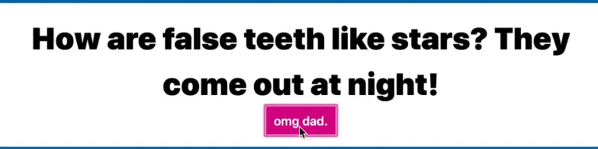 Every time you click the button, a new random dad joke should be fetched from the API and displayed and the button text will change occasionally.