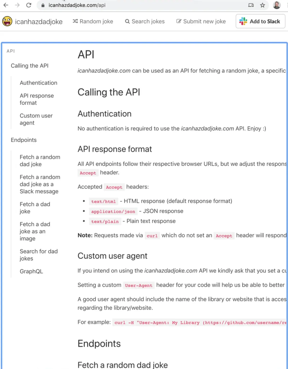 Let's look at the API docs for fetching a random joke.