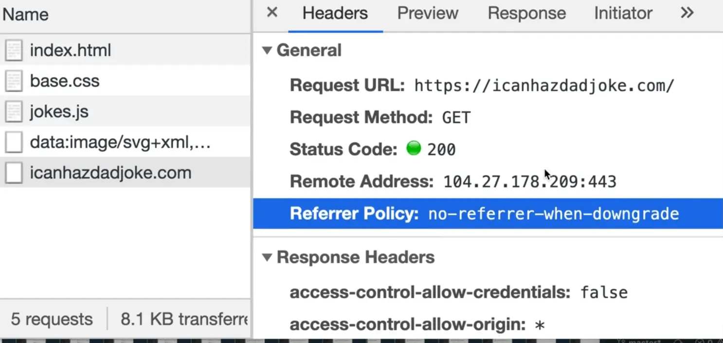 If you look at our dad joke API fetch request in the network tab and click it, you can click the headers tab and see the headers that were passed along with the request, and the ones that were passed along with the response.