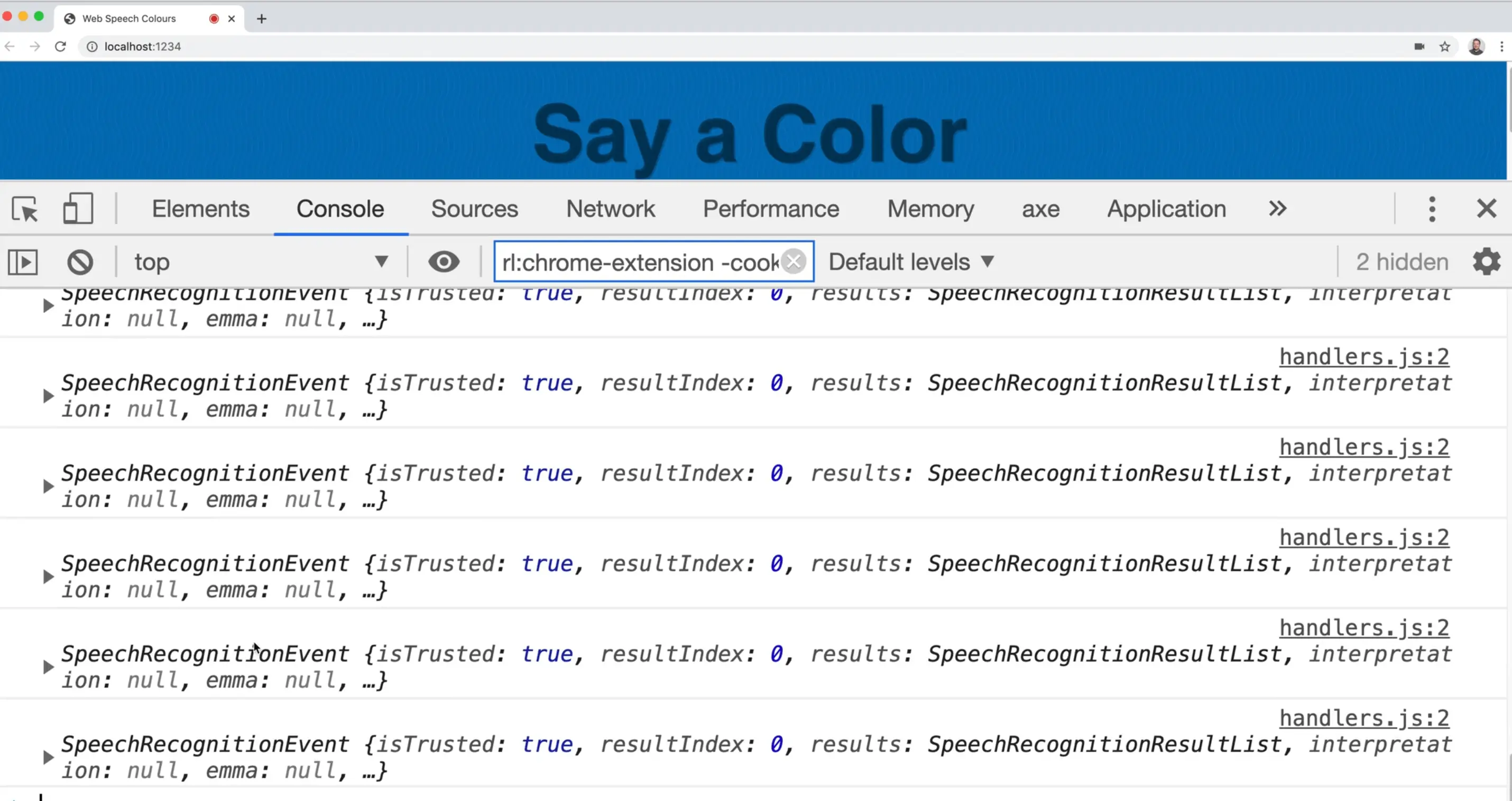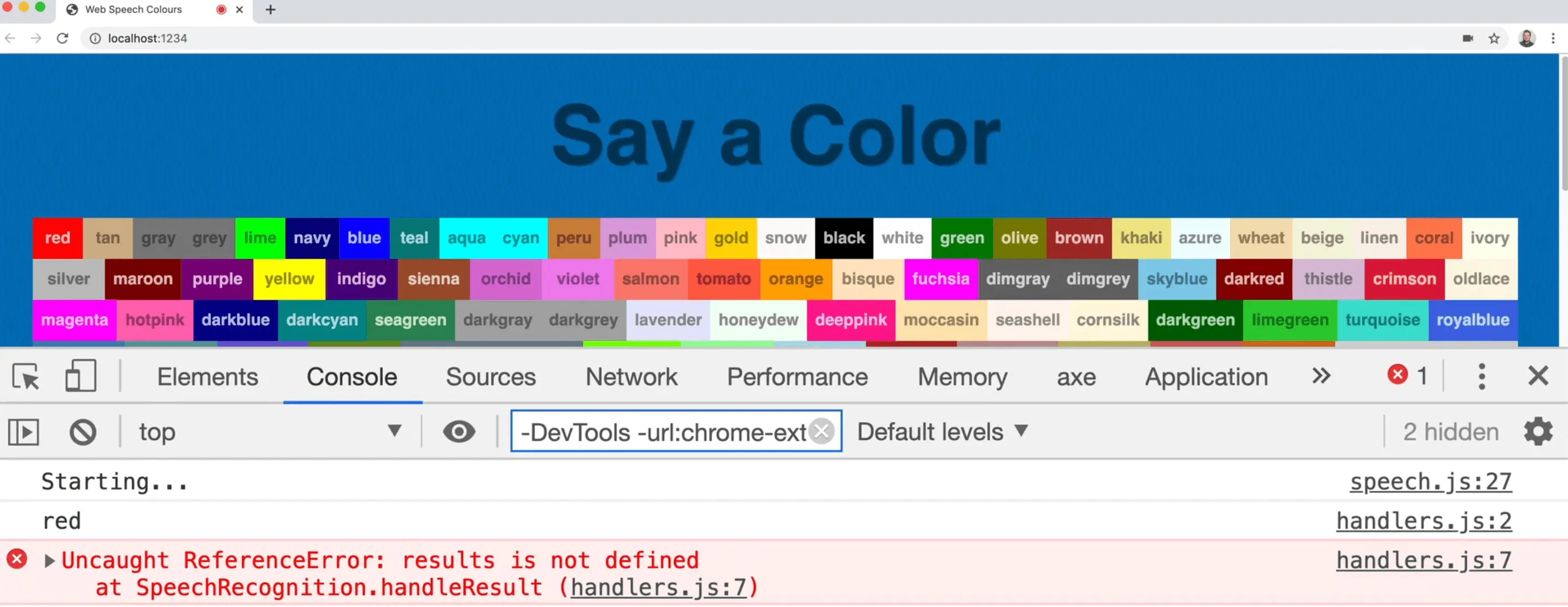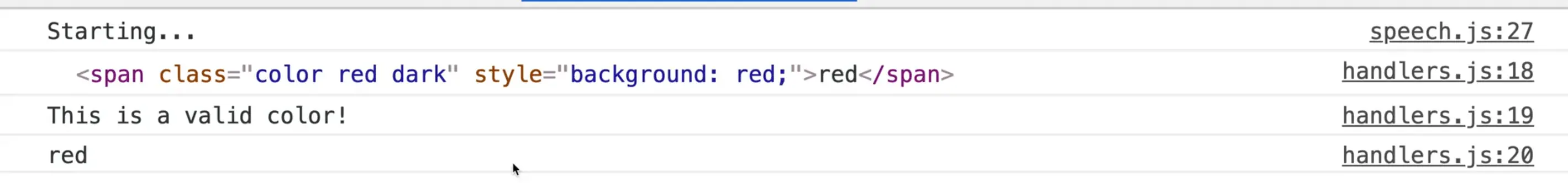 If you try speaking the color red when the page refreshes, you should see the red color span logged.