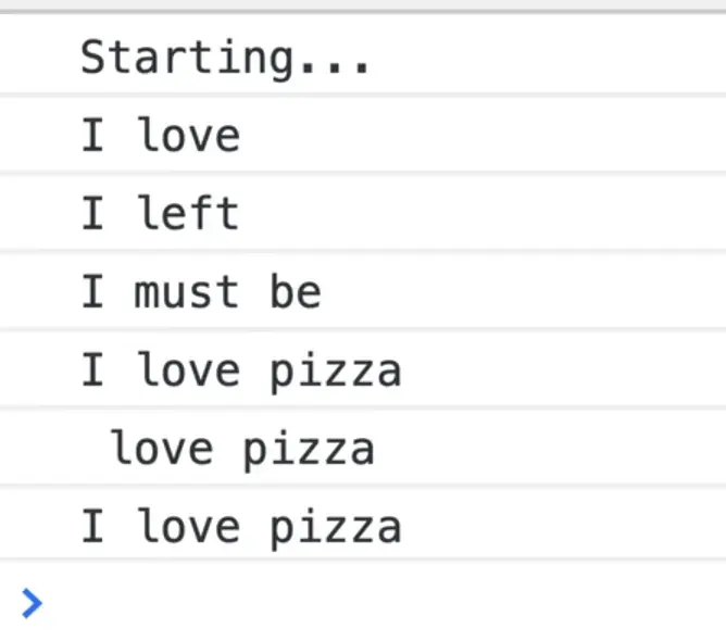 Now if you refresh the page and try to say something like "I love Pizza", you will see that logged in the console.