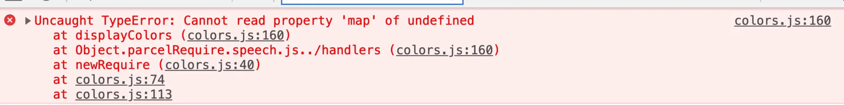If you look at our speech.js file, you will see that we forgot to return the colors map in our displayColors function. Fix that by adding the return keyword before the map.