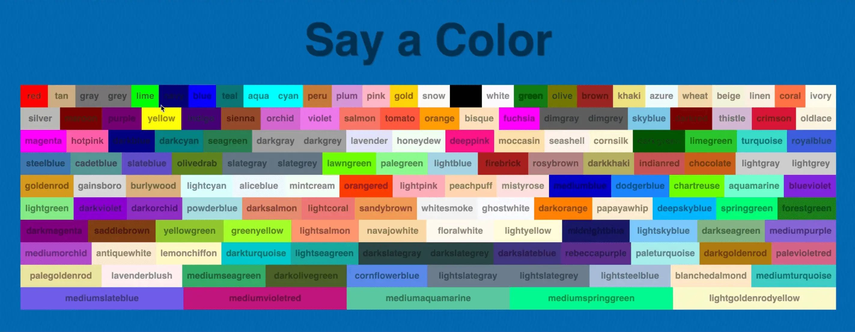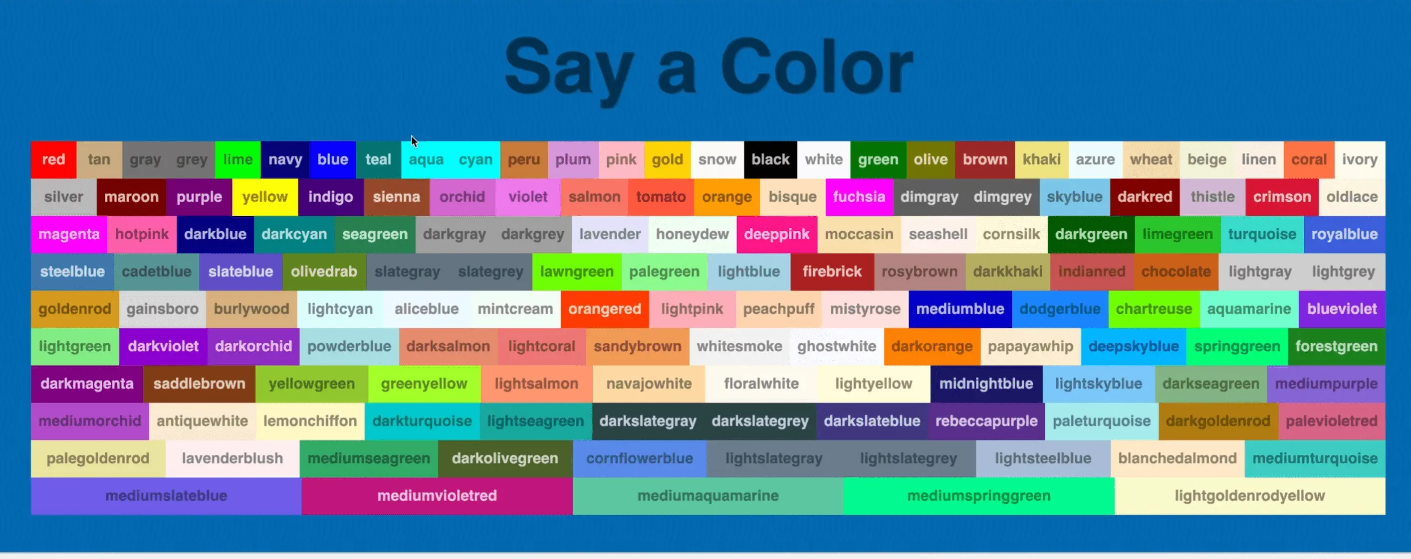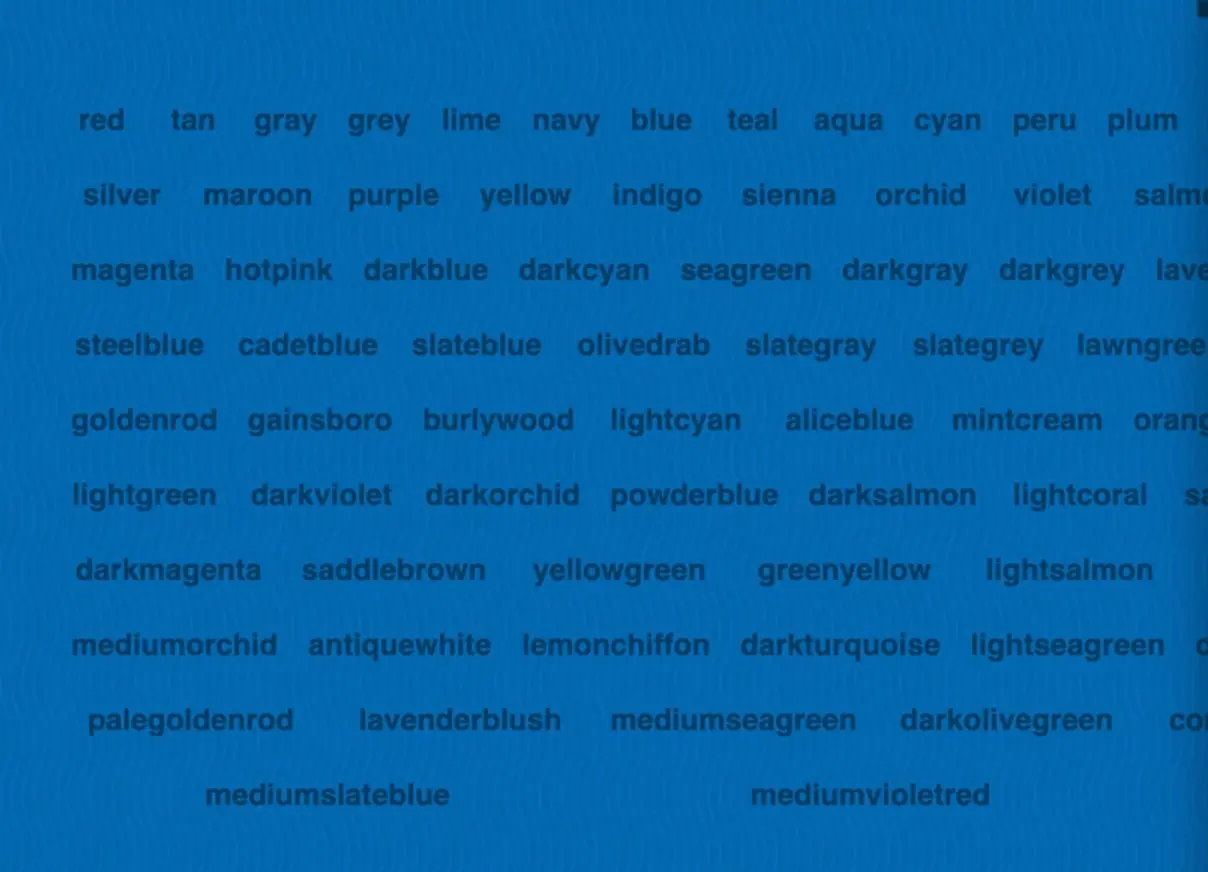 Wes has given us colors.js which gives us an object containing every color that is available in CSS, and it's corresponding hex code.