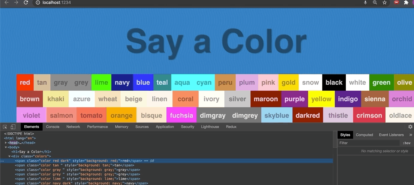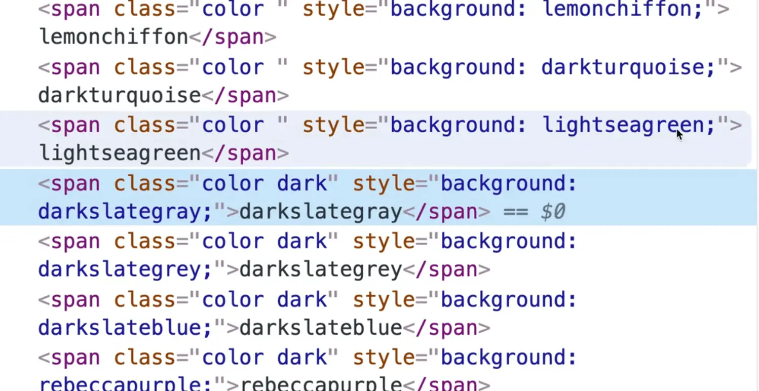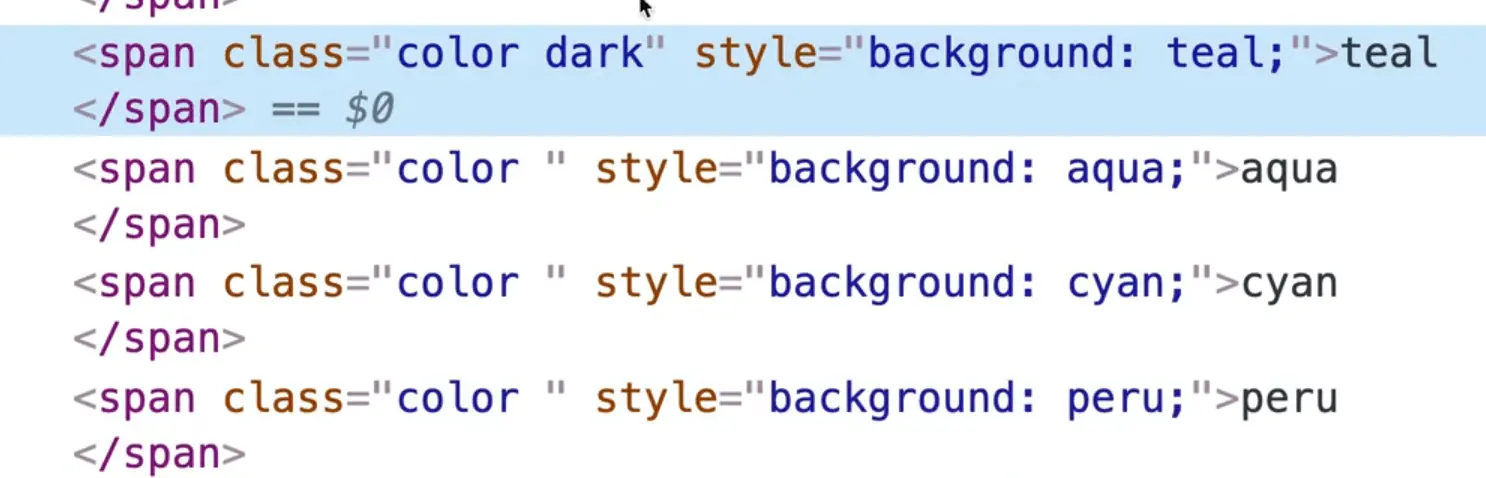 However, we have run into an issue. We need a way to select a specific span and as you can see above, there is no way to identify the correct span. Let's fix that to add the color's name as a class in addition to the color class.