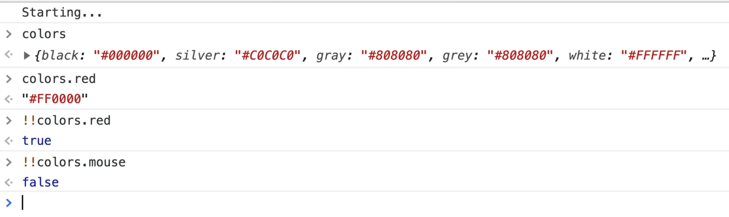 Calling colors.red will return the hex, but calling !!colors.red will return true and if the property doesn't exist, it will return false.
